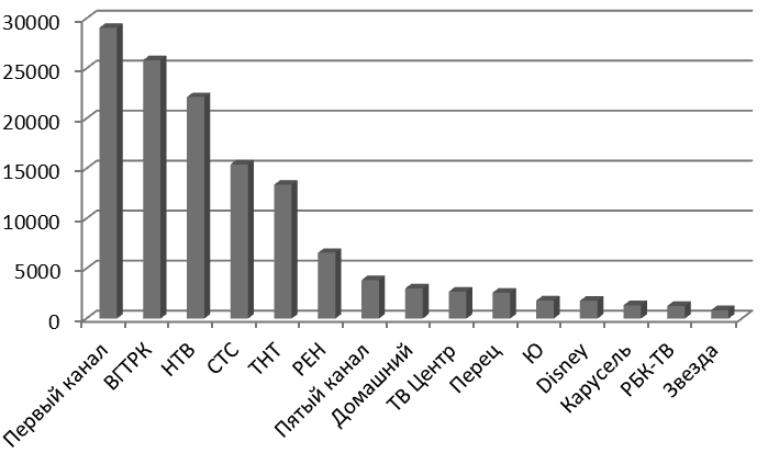 * Допущена вынужденная погрешность, т. к. отдельные данные по выручке телеканалов «Профмедиа ТВ» (ТВ3, MTV, 2Ч2) и «Мир» отсутствуют в базе ГМЦ Росстата.