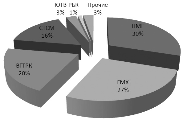 Что касается российской медиаиндустрии в целом, то наиболее понятным является финансовое положение эфирного телевидения, а именно федеральных каналов. Этот сегмент весьма компактен – его образуют всего 19 предприятий-вещателей, на которые, в свою очередь, приходятся 22 СМИ (решение ФАС и Роскомнадзора). Большинство вещателей контролируют 7 медиахолдингов. При этом федеральное телевидение является самой экономически мощной частью отрасли (на него приходится около 40 % объема рекламного рынка), в связи с чем этот сегмент отражает ключевые тенденции ее развития и, в частности, выглядит довольно репрезентативно для оценки уровня концентрации (см. Рис. 13, 14, 15, 16). Хотя следует признать, что эфирное телевидение, как правило, и является наиболее концентрированным сегментом медиарынка.