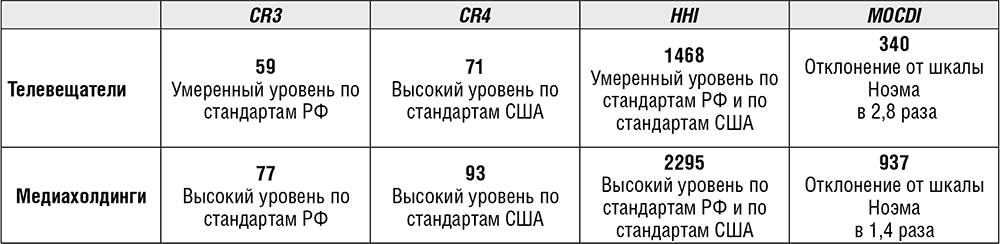 Поскольку в разделах работы содержатся ее основные выводы, имеет смысл вкратце обозначить видимые векторы дальнейшего исследования проблемы. Мы выяснили, что расчет показателей CR3 (CR4), HHI и MOCDI для российской медиаиндустрии на данный момент возможен лишь в частных случаях. Оценить уровень концентрации в соответствии с принятыми шкалами по отрасли в целом, а также в большинстве ее сегментов не удается из-за объективных препятствий. На наш взгляд, три имеющихся в научном арсенале индекса не учитывают всей сложности этой отрасли, являющейся также социальным, культурным и политическим институтом. Финансовые показатели предприятий, очевидно важные с экономической точки зрения, не могут дать представления об интегральном значении того или иного объединения СМИ для общества. Поэтому не менее значимым показателем для оценки уровня концентрации является объем аудиторий, аккумулируемый медиахолдингами. Свою роль играет и количество контролируемых ими СМИ, поскольку от этого зависит и рыночное разнообразие, и плюрализм повестки дня.