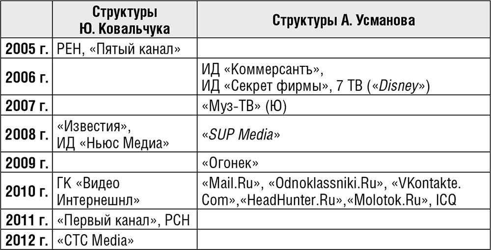 Таблица 20. Хронология ключевых приобретений медиаактивов бизнес-структурами Ю. Ковальчука и А. Усманова[98]