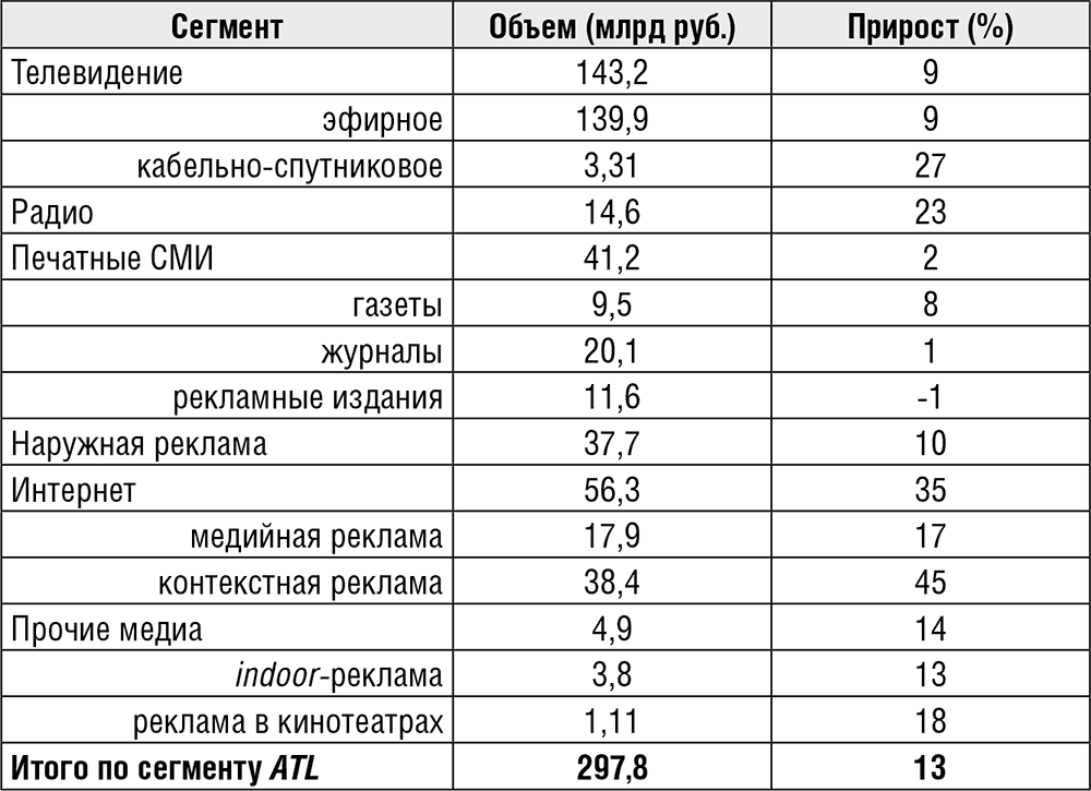Таблица 21. Медиарекламный рынок России в 2012 г. (сегмент ATL)