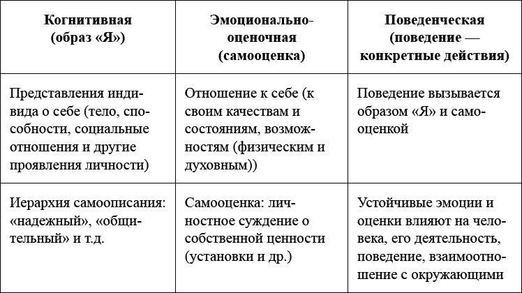 Я-концепция представляет собой динамическую систему взаимосвязанных самоустановок: когнитивной, эмоционально-оценочной и поведенческой (табл. 1).