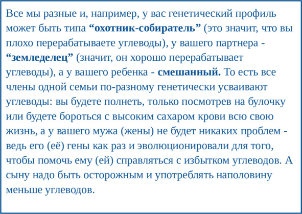 Раз уж мы заговорили об углеводах, важно отметить, что люди обладают разной способностью извлекать и усваивать сахар из крахмалистой пищи в процессе пищеварения, в зависимости от того, сколько копий определенного гена они унаследовали. В отличие, например, от плотоядных сибирских якутов, у популяций, которые ели больше продуктов, богатых крахмалом (таких как хадза, о которых говорилось ранее), больше копий определенных генов, стимулирующих ферменты, которые помогают расщеплять крахмал до того, как пища попадёт в желудок.