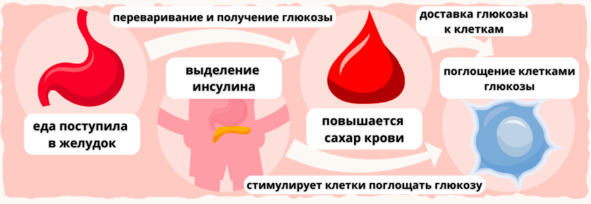 Этот сигнал от повышенного сахара в крови стимулирует поджелудочную железу к выделению небольшого количества инсулина, который поступает в кровь, присоединяется к инсулиновым рецепторам на клеточной мембране и помогает доставить сахар из крови в клетки. Когда весь избыток глюкозы распределяется по клеткам, выработка инсулина снижается до исходного уровня, и уровень глюкозы в крови также падает.