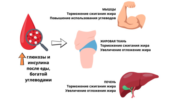Рисунок 2. После приема богатой углеводами пищи в крови повышается уровень глюкозы и инсулина. Впоследствии печень увеличивает производство жира, отложение жира в виде жировой ткани увеличивается, и в то же время сжигание жира как в мышцах, так и в печени замедляется. Таким образом, повышение уровня глюкозы и инсулина в крови всегда приводит к отложению жира.
