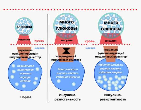 В норме клетки очень чувствительны к небольшому количеству глюкозы и небольшому количеству инсулина, который выделяется в ответ на повышение уровня глюкозы в крови. В случае инсулинорезистентности эта чувствительность к действию инсулина нарушается, потому что инсулина слишком много и он циркулирует в крови очень долго – образно говоря, утомляя клетки своим присутствием.