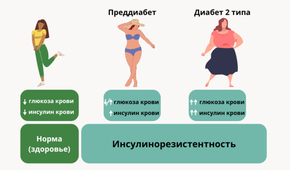 Развитие инсулинорезистентности приводит к компенсаторному увеличению выработки инсулина. Повышенный уровень эндогенного (своего) инсулина, анаболического гормона, связан с инсулинорезистентностью и приводит к увеличению веса, что, в свою очередь, усугубляет инсулинорезистентность через различные механизмы и может способствовать развитию диабета 2 типа39.