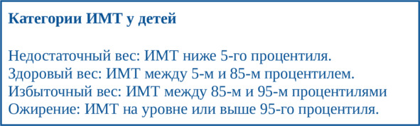 В случае с детьми рост и вес отображаются в процентилях. Процентиль ИМТ ребенка рассчитывается путем сравнения его ИМТ с таблицами роста детей того же возраста и пола.