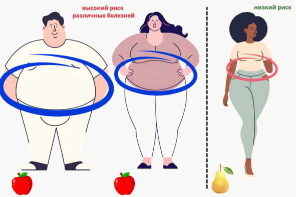 Рисунок 5. Если поделить разные виды отложения жира в теле на более и менее благоприятные, то отложение жира по типу «груши» (справа) будет более благоприятным, чем «яблоко». В случае «груши» обхват талии остаётся в пределах нормы, а жир откладывается в основном в бёдра, а также в молочные железы. Для «яблока» характерно основное отложение жира в области живота, обхват талии значительно увеличивается, что является наиболее неблагоприятным и несёт с собой повышенные риски сердечно-сосудистых и заболеваний обмена веществ.