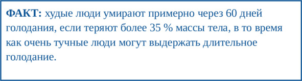 Самое длительное из известных голоданий было зафиксировано у мужчины с сильным ожирением, который постился 382 дня, употребляя только высококалорийные жидкости, витамины и минералы, что привело к потере веса на 60% без осложнений.44