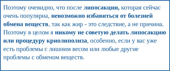 Также было доказано, что удаление подкожного жира не приводит к положительным изменениям в метаболизме человека и не способствует устойчивому снижению веса. Речь идет о процедуре удаления подкожного жира, который ни в коем случае не представляет опасности для здоровья и не является причиной ожирения и нарушения обмена веществ. Напротив, удаление этого подкожного жира способствует проблемам с обменом веществ: в результате больше жира начинает накапливаться во внутренних органах и между ними (что гораздо опаснее), поскольку удаленные из подкожного слоя жировые клетки не могут быть восстановлены, организм не может их больше вырастить, и поэтому вынужден искать другие места для отложения токсинов и жира, и в итоге решает нарастить больше висцерального жира.