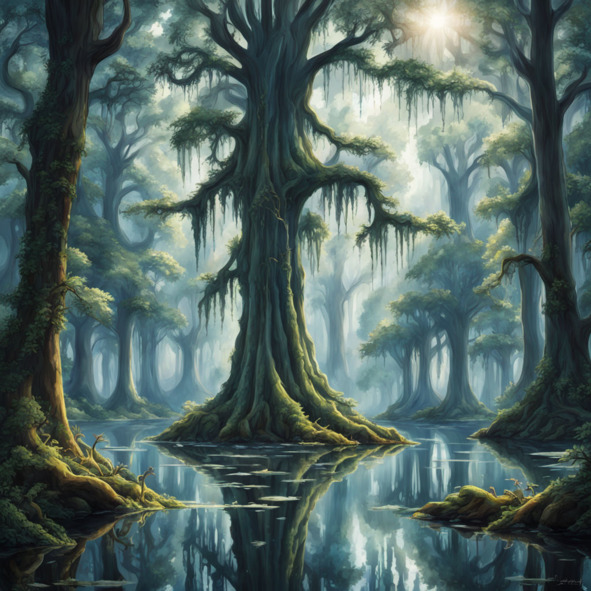 Beyond the Upside-Down River, Eliot found himself in a part of the Enchanted Forest he had never seen before. Here, the trees stood tall and proud, their trunks wide and leaves shimmering with a silver sheen. This was the Forest of Mirrored Lakes, a place where the water mirrored not the sky above but rather worlds beyond.
