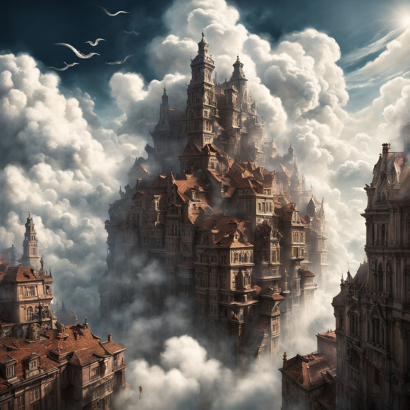 Before him lay a city suspended in the sky, its buildings carved from clouds and its streets lined with vapor. The City in the Clouds was alive with the laughter of its people, who glided through the air with the grace of dancers. They were the Skyfolk, beings of air and light, with voices that sounded like the whispering wind.