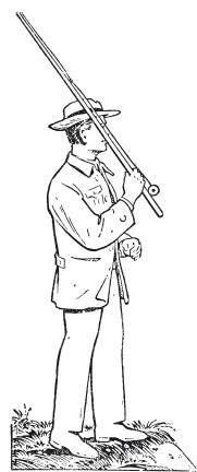 Закидывание лески одноручным удилищем должно совершаться следующим образом. Прежде всего собирают удилище, т. е. вкладывают колена одно в другое, так, чтобы кольца находились бы на одной линии, закрепляют катушку в гнезде и, смотав потребное количество шнурка, сначала не более 4,2 м, пропускают его через кольца и привязывают лоскуточек. Затем становятся саженях в трех (6,3 м) от цели, почти прямо против нее, берут удилище правой рукой над катушкой, повернутой книзу, так, чтобы большой палец лежал сверху на удилище и чтобы остальные пальцы легко обхватывали рукоять удилища без всякого напряжения. Удилище держат почти вертикально, слегка наклоненным вперед, причем кисть руки находится на уровне лица, на расстоянии 15 см от него, а локоть опущен свободно и не приподнят. Затем большим и указательным пальцами левой руки берут лоскуточек, заменяющий мушку, и оттягивают его подальше от туловища, так, чтобы леска висела совершенно свободно, не прилегая к платью.