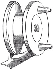 Главное отличие нотингэмской катушки от обыкновенной заключается именно только в том, что она до такой степени неустойчива по своей оси, что малейшее усилие приводит ее в быстрое вращение, так что леска сматывается с нее силой течения, увлекающего поплавок. Эта легкость вращения обусловливается прежде всего тем, что катушка имеет две рукоятки совершенно одинаковых размеров, затем ее величиной и толщиной средней части; делается она обыкновенно деревянной и, как видно из прилагаемого рисунка, имеет вид шпульки, вращающейся на медной оси, крепко утвержденной в вертикальной медной стойке, которая, в свою очередь, прикреплена к медной планке, вставляемой между двумя кольцами – подвижным и неподвижным, находящимися на толстом колене удилища. Последнее должно быть не особенно длинно, по возможности легко и упруго, но не слишком гибко, вообще высокого качества и обязательно со стоячими, хотя и небольшими кольцами, что не требует объяснения.