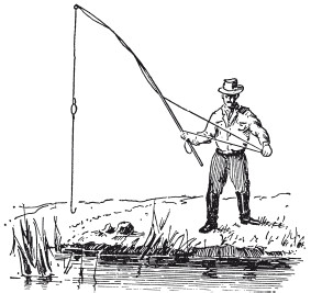 При ужении с нотингэмской катушкой, которая приводится в быстрое вращение при малейшем усилии, можно, конечно, закинуть крючок дальше, чем при ужении с обыкновенной катушкой, ибо даже очень легкая леска при своем падении на воду в состоянии смотать с этой катушки несколько лишних метров шнурка. По всей вероятности, при нотингэмском ужении с берега можно употреблять и другой, несколько видоизмененный способ закидывания легкой лески, употребляемый мной при ужении щук (см. ЩУКА), но с тяжелым грузом, насадкой и поплавком и с обыкновенной катушкой, даже с трещоткой, которая, конечно, представляет значительное сопротивление. Предварительные манипуляции со шнурком те же, но насадка забрасывается вдаль сильным размахом самого удилища. А так как последнее необходимо держать в одной (правой) руке (левая оттягивает шнурок вбок, как показано на рисунке), то такое закидывание возможно только при легком удилище или при значительной физической силе.