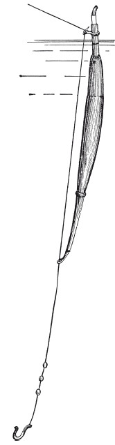 На донную с руки ловят только с лодки. Для этой цели употребляются короткие удильники из китового уса, сантиметров 30, вставленного в пробковую, реже деревянную рукоятку, в 18 см длиной; иногда к рукоятке приделывается кольцо сантиметров 5 диаметром, в которое просовывается палец; делается это ради того, чтобы крупная рыба не могла вырвать удочку из рук. Леска – тоже 8,4-10,5 м; на крючок насаживают 8-10 опарышей, задевая их за головки; грузило (тоже легкое) находится на расстоянии 10 см от крючка и держит глиняный шар величиной с небольшое куриное яйцо. Донные с колокольчиком имеют очень длинные лески, до 21 и более метров; грузило употребляется редко, а вместо него на небольшом расстоянии от крючка находится небольшой кубик из пробки, который и служит для поддержки глиняного шара (с опарышами) величиной с куриное яйцо или более. Леску собирают в кольца, закидывают обыкновенным порядком, рассчитав потребную силу размаха, а удильник втыкают железным острием в берег или в дно лодки. Обыкновенно ловят на 2–3 такие удочки зараз. Клев и время подсечки узнаются по звону бубенчика или колокольчика. Если рыба, разбив шар, не взяла насадку или если шар распустится раньше, чем рыба взяла его, пробка всплывает кверху и поднимает крючок. Грузило может быть заменено куском пробки и при ловле с руки на длинную и короткую удочки, но в этом, конечно, нет такой надобности, как в данном случае.
