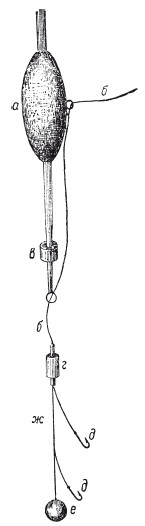 Очень часто приходится ловить линей и карасей на прудах и заливных озерках, окаймленных очень широкой полосой травы; лодки же не имеется. В таком случае приходится прибегать к помощи уже описанного скользящего поплавка (см. о ловле щук), хотя и небольших размеров. Но так как успех ловли зависит много от верно поставленного поплавка, а измерить глубину здесь невозможно, то всего лучше употреблять скользящие поплавки, показывающие вместе с тем глубину.