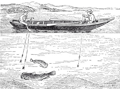 Самый лучший способ вытаскивания небольших сомов заключается в том, что тащат его на поверхность, к лодке, как можно ровнее и вместе медленнее, без толчков и торопливости, безостановочно перебирая бечевку двумя пальцами обеих рук по очереди. Сом, достаточно утомившийся на удочке, идет кверху очень ходко, особенно если крючок у него в желудке: он виснет, как гиря, опустив вниз хвост и изредка помахивая головой. Мелких сомят, до четырех и более килограммов, надо вытаскивать без всяких церемоний и как можно скорее, если, конечно, они не попали на снасть, предназначенную для еще более мелкой рыбы; в сачке особенной надобности нет и лучше тащить добычу прямо в лодку или на берег. Сачки при вытаскивании сомов употребляются редко и рыболовы чаще пользуются (для крупных) багром, который подводится со стороны хвоста к голове и зацепляется под нижнюю челюсть; средних, около 16 кг, всего удобнее тащить или за жабры, особенно с берега, или же (с лодки) следующим очень простым, в сущности, приемом: подтащив утомленную рыбу, всовывают ей в рот четыре пальца руки, а большим сильно вдавливают в рот подбородок, обхватив таким образом нижнюю челюсть сверху и снизу, и этим отгибанием парализуя силу челюстей рыбы, вваливают ее через борт в лодку. Сомов покрупнее приходится тащить обеими руками, подхватывая другой под жабру, а помельче, около 8 кг, – вкладывая в рот большой палец и вдавливая указательным подбородок.