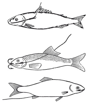 Рис. 130. Различные способы насаживания живцов: сверху – через ноздрю; посредине – через рот и жaбpу; снизу – через рот и задний проход