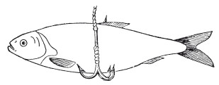 При обыкновенных способах всегда приходится выжидать некоторое время для того, чтобы дать хищнику, особенно щуке, время заглотать насадку. При ужении щук, а также если они берут вяло и, подержав живца во рту, выплевывают его, гораздо удобнее снаряд, состоящий из тройного крючка (больше или меньше), привязанного к басковому поводку, и одиночного крючка, привязанного на расстоянии 0,6 или 1 см над тройным. Одиночный крючок зацепляют за спинку живца, а тройной свободно висит сбоку.