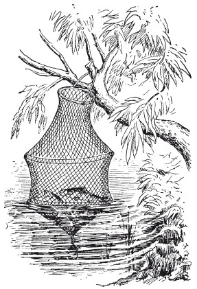 Корзины, или сажалки, для хранения рыбы обыкновенно имеют форму бочонка с ушками и небольшой крышкой посередине, как у бочек, или четырехугольной корзины с ручкой и крышкой наверху в половину длины. Делаются эти корзины большей частью из ивняковых прутьев. Чем чаще вплетены они, тем лучше, потому что при переездах на лодке рыбу в сажалке не забивает водой и нет надобности предварительно вытаскивать корзину из воды, подобно кружку. При переносе корзины с одного места на другое или перед возвращением домой пойманную рыбу перекладывают в ней мокрой травой.