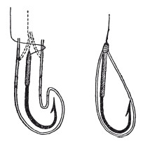 Очень часто, при нерешительном клеве сазана, случается, что он берет червя за его нижний край, находящийся на сгибе крючка, так что острие последнего остается свободным, и сазан после подсечки, конечно, уходит. В таком случае вместо того, чтобы насаживать червя согнутым, следует надевать его, как футляр, так, чтобы сгиб крючка лежал в самом конце червя. Для того же, чтобы последний крепче держался на месте, за него слегка задевают жалом крючка, для чего достаточно надавить на червя в том месте, где чувствуется жало. Всунув крючок (сгибом вперед) так, чтобы сгиб его лежал в самом кончике червя, головной конец последнего привязывают двумя оборотами суровой нитки, кончики которой вплотную обрезывают (рис. 150). При таком способе насаживания сазан не может взять червя, не взяв вместе с тем и жало крючка в рот.