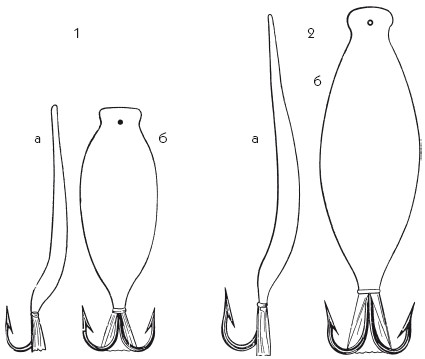 Рис. 154. Сердобские блесны: 1 – для окуней: а – сбоку, б – сверху; 2 – для щук: а – сбоку, б – сверху