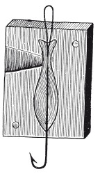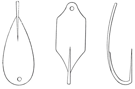 Московская блесна состоит из трехгранного куска олова с подобием рыбьего хвоста наверху и одним крючком внизу.
