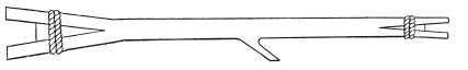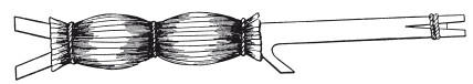 Удилища для блесненья употребляются или довольно длинные, около 2,8 м, и не очень гибкие, или же, напротив, очень короткие и гибкие, в виде прутика в 0,7 м и менее, который, для того, чтобы его ловчее было держать, обертывается камышом. В Западной Сибири удильником служит так называемый мотылек – прутик сантиметра 33 длиной и толщиной в мизинец; на середине его оставляется сучок в 3,3 см длины. Оба конца прутика надкалываются ножом; в расколотые места вкладываются маленькие клинышки, и расколы стягиваются тонким шнурком. Затем на часть прутика а накладывают кругом, в несколько рядов, камыш, натуго перевязывают его в трех местах шнурком, а концы обравнивают ножом. Один конец лески привязывают к месту мотылька, обозначенному через а, и наматывают ее через сучок в и надкол б. На свободном конце ее делается петля, посредством которой она прикрепляется к шнурку. Такой мотылек в особенности пригоден для блесненья на очень больших глубинах. На глубине же 4,2–6,3 м удобнее ловить на длинное удилище.