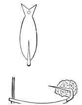 Из пластинки желтой или красной меди толщиной в пятак высекается или выпиливается желаемой формы блесна. На обоих концах ее просверливается по одной дырочке. Заблаговременно заказывают кузнецу выковать из обуха негодной косы прутик толщиной в 3 мм. Конец такого прутика, на 4,5 см длины, закрепляется и заостряется напилком и отсекается. Нелишне накалить его докрасна на углях и дать ему постепенно остынуть, чтобы он был мягче и при загибании не ломался. Тупую оконечность его отгибают в ручных тисках под прямым углом.