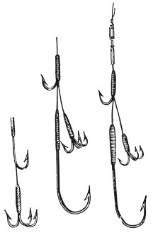 Так как успех описываемого способа зависит от постоянного вращательного движения рыбки – ее игры, то для достижения этого придумано много различных сэтов. Последние должны удовлетворять следующим требованиям: 1) давать насадке по возможности лучшую игру, особенно в том случае, когда для успешного ужения необходимо, чтобы рыбка подтаскивалась (толчками) к себе довольно медленно, так как хищник может увидеть крючки на плохо играющей рыбке; 2) зацеплять наибольший процент клюнувших рыб, для чего крючки и якорьки сэта должны быть расположены так, чтобы они не мешали друг другу; 3) терять наименьший процент зацепленных рыб, т. е. быть устроенным таким образом, чтобы по крайней мере один якорек, как бы рыба ни взяла насадку, спереди, сбоку или сзади, при подсечке забрал как следует.