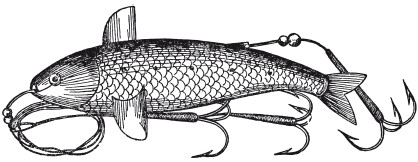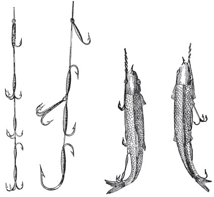 Как рыбка насаживается на эти сэты, легко можно понять из прилагаемых рисунков; следует только заметить, что жилки между крючками должны быть не слишком наслаби, не слишком натянуты, так как и то и другое мешает бойкой и правильной игре насадки. Последней служат обыкновенно рыбки брусковатой формы (ельцы, голавлики, мелкие усачи, также пескари и гольяны), которые играют лучше плоских. За неимением первых можно употреблять, например, плотичек, но в таком случае, вместо изгиба хвоста, ей дается изгиб спины, как это иногда делается и с брусковатыми рыбами.