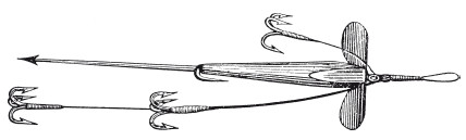Как было говорено раньше, для того чтобы рыбка хорошо играла, она должна быть хорошо насажена; между тем это не всегда удается, особенно пока не приобретется известный навык. Чтобы облегчить эту задачу, англичане придумали различные снаряды, spinner'bi, из которых лучший так называемый Chapman's spinner. Состоит он из двух медных лопастей, изогнутых по принципу архимедового винта; к ним припаяна медная проволока с крючком, верхняя часть которой облита свинцом; сквозь меднопроволочное ушко, находящееся между лопастями, пропущены накрест жилковые поводки, к которым привязаны якорьки. Проволока впускается в рыбку через горло до тех пор, пока нижние края лопастей не упрутся в углу ее рта; вместе с тем крючок, находящийся по средине проволоки, там, где начинается свинец, легким давлением руки на живот рыбки вонзается в него и не дает лопастям сдвинуться с места. По одному крючку от верхних якорьков вонзается в насадку, а третий якорек оставляют свободным.