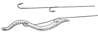 Черви для насадки выбираются смотря по местности. Иногда форель лучше берет на мелкого червя, иногда на крупного, но вообще следует заметить, что по глухим речкам лучше ловить на обыкновенного земляного червя, живущего тут же в берегах и хорошо знакомого рыбе, которая здесь вовсе не знает красного навозного, а тем более большого червя (глист, глистовка, выползок, бертыль, росовой, дождевой червь), который водится преимущественно в садах и огородах. Есть местности, где никакая рыба почти не берет на выползка. Насаживается червь на крючки соответственной величины, крупные на № 0 или 1–2, а простые земляные и навозные на 3–6, пониже головы, отпуская длинный хвостик, если форель не объедает червя. В последнем случае удобнее насаживать червя на стюартовскую снасточку из 2–3 небольших крючков. Червь предпочитается очищенный, т. е. лежалый и с пустыми внутренностями, так как такой крепче сидит на крючке и рыба охотнее его берет. В мутной воде, однако, по мнению многих иностранных авторов, лучше насаживать свежего, неочищенного и более вонючего червя, потому будто, что форель дальше его чует. Обоняние у рыб вообще гораздо сильнее развито, чем обыкновенно думают.