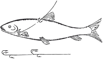 Об ужении на живую рыбку тоже не стоит особенно распространяться. Живцом могут быть гольян, пескарик и голец, иногда подкаменщик. Лучше всех гольян, который хотя и не так крепко сидит и не так долго живет на крючке, но бойчее ходит и не забивается под камни, как прочие. Местами форель недурно берет на небольшую уклейку, но последняя очень хлипка и гораздо скорее снет, чем гольянчик. Насаживают большей частью за губу, на одиночный крючок № 1–4, привязанный к крепкому, но нетолстому жилковому поводку на карабинчике. Иногда, при неверном клеве в особенности, употребляют Джардиновскую снасточку с двумя двойниками и добавочными третьими крючками. Ловят на живца почти всегда с катушкой, и удилище должно быть довольно жестко, а шнурок толще, чем при ловле на червя, тем более на мушку. Можно удить с поплавком, но лучше без него, опуская и приподнимая живца (в глубоких омуточках) или пуская его по течению (на перекатах, под шлюзами). При ловле с поплавком рыбку пускают в полводы и никак не глубже как на 18 см от дна. При ловле на одиночный крючок надо выждать, чтобы форель забрала живца; при Джардиновской снасточке подсечка должна следовать немедленно за поклевкой. В общем, ужение форели на живца мало различается от таковой же ловли лосося.