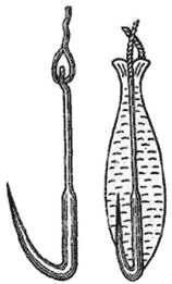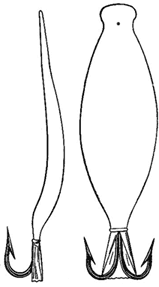Лучшей из оловянных блесен, на основании личного опыта, я признаю сердобскую, имеющую выгиб, а в разрезе форму равнобедренного треугольника с очень тупым углом в вершине и двойным крючком (в хвосте). Московская блесна – трехгранный кусок олова с одним крючком в голове – слишком тяжела и пригодна только для осеннего блеснения, так же как, по всей вероятности, новгородская – плоский овальный кусок олова (а иногда и свинца) с одним крючком.