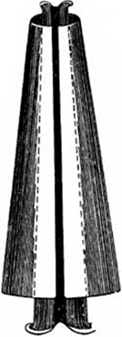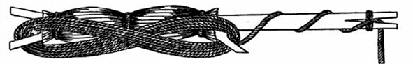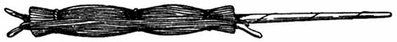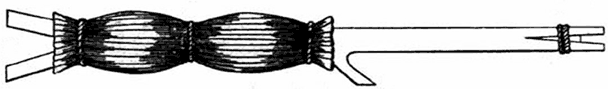 Блесна обыкновенно непосредственно привязывается к лесе, но так как при этом способе прикрепления блесна не может очень быстро колебаться, то лучше вставлять в отверстие небольшое медное колечко, края которого спаиваются. Карабинчики (см. щука) хуже этих колечек. В поводке нет особой надобности, по поводок из хорошей жилки никогда не может быть лишним, а если можно рассчитывать на щук, то полезно употреблять поводки из баска, а за неимением таковых – из тонкой медной проволоки, вдвое скрученной. Леска осенью лучше смоленая шелковая, средней толщины (№ 4 английской), но зимой предпочтительнее волосяная (в 6–9 волос), которая не примерзает ко льду и, вынутая из воды, не смерзается. Удильник для осеннего блеснения должен иметь длину не менее 3–4 аршин и делается или цельный (из можжевельника, березы), или из двух, редко трех колен. В обоих случаях кончик не должен быть очень гибок и жидок; в складном удильнике лучше всего кленовый или жимолостный. Для блеснения из прорубей удильник делается из гибкого прутика (можжевелового, березового) в аршин-полтора длиной; комель, чтобы удобнее было держать, обертывается камышом. Всего удобнее для зимнего блеснения западносибирский мотылек (рис. 8), от которого саратовская зимняя удочка отличается только длиной и тем, что составлена из двух частей (рис. 9). Мотылек – прутик вершков 8, с сучком в ¾ вершка посредине; оба конца надкалываются ножом, в расколотые места вкладываются маленькие клинышки и стягиваются тонкой бечевкой. Затем на часть прутика накладывают кругом, в несколько рядов, камыш (куга), натуго перевязывают его в трех местах бечевкой и обравнивают. Леска наматывается на сучок и надкол (рис. 10). Саратовская зимняя удочка имеет длину – до аршина и употребляется также и для зимнего ужения на червя. Можно, разумеется, блеснить и на кобылки (см. ерш) большого размера, но не иначе как с более длинным и очень грубым кончиком.