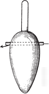 Неудобства эти до некоторой степени устраняются следующим образом. Просверлив хорошую пробку посредине и подчистив сделанное отверстие круглым подпилочком, придают ей форму очень удлиненного яйца. В верхний тупой конец ее вклеивают перяную трубку, а в нижний, тонкий, – конический кусок свинцу со стержнем из медной проволоки, обмотанной слегка ватой. На расстоянии 1/2 дюйма от верхнего конца пробки прожигают раскаленною проволокою поперечное отверстие и вставляют в него трубку утиного пера, затыкающуюся клинышком из того же пера. Затем свинцовый конус обтачивается, насколько это нужно (для чего выверяют его в стакане с водой), для того чтобы поплавок погружался до нижнего края поперечного отверстия. Поплавок окрашивается масляной краской (подводная часть – зеленой, верхняя, включая и трубку, – белой краской) и покрывается копаловым лаком. (Рис. 77.)
