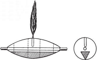 Для того чтобы поплавок этот был виднее, полезно просверлить в середине его небольшое отверстие, перпендикулярное к оси его, немного не доходящее до продольного отверстия, в котором ходит леска. В это поперечное отверстие вставляется трубка тоненького пера, а в последнюю, когда понадобится, – белое перышко, как изображено на рисунке.