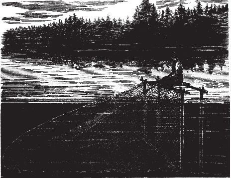Величина сети различна, но самое устье ее не должно быть менее сажени в диаметре, а длина менее двух. Вяжется она из тонких, но самых крепких ниток, б. ч. трехпалечными ячеями (так, чтобы в ячею вкладывались три пальца и мелочь проходила бы беспрепятственно). Чтобы сделать сеть еще менее заметной, нелишне ее окрашивать в светло-зеленую или желтоватую краску, но достаточно и продубить ее. Ставится эта сеть или ближе к берегу, особенно весною, или же посредине русла на самом стремени, вообще же там, где главный ход рыбы. Способ прикрепления сежи следующий. В дно поперек реки вколачивают две пары толстых кольев, оканчивающихся развилками; каждая пара отстоит от другой на 3–9 аршин, смотря по величине сети; расстояние между кольями каждой пары равняется 1–11/2 аршина, а вершины кольев возвышаются над уровнем воды примерно на пол-аршина. На эти колья кладутся две перекладины, а на последние настилаются доски, на которых и сидит рыболов.
