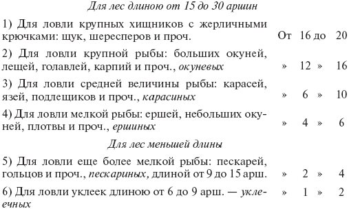 Толщина лесок зависит от длины их, качества волоса и той рыбы, для ловли которой предназначается леса. В виде примера предлагаются следующие размеры.