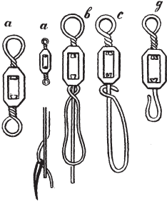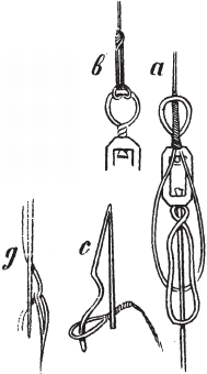 Поводок соединяется с лесой обыкновенным способом, т. е. петля поводка продевается в петлю на конце лесы. Но для того чтобы живец, плавая, не закручивал лесу (особенно шелковую), весьма полезно употреблять т. н. карабинчики. Различные формы их и способы скрепления их с поводком и лесой представлены на рис. 52 и 53.