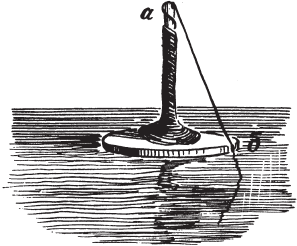 В прудах и небольших озерах вместо описанных рогулек-жерлиц на шестиках гораздо удобнее и безопаснее употреблять кружки, или поставуши. Кружки эти делаются из пробковой коры и должны быть толщиною в палец, а диаметром около 3 вершков. В центре кружка провертывается буравчиком небольшое отверстие, в которое вставляется натуго палочка вышиною не более четверти. К основанию этой палочки привязывается более или менее толстая бечевка длиною в 5–10 сажен со свинцовым грузилом, баском и жерличным кружком; бечевка аккуратно наматывается на палочку до тех пор, пока не останется конец в аршин или более, смотря по глубине, на которой должен плавать живец, а чтобы этот последний не мог смотать бечевку, бечевка слегка защемляется в прорезку (а) наверху стойки. Щука, схватив живца, выдергивает из расщепа бечевку, опрокидывает кружок и разматывает веревку так же свободно, как с рогульки.