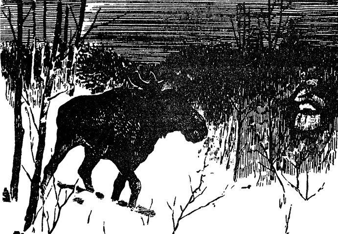 При более благоприятных условиях, то есть когда над настом лежит на вершок мягкий, как пух, но немокрый снег, когда погода ветреная и лес шумит, подход этот немного изменяется. Если лоси шли на кормежку против ветра, то есть тропа находится относительно лосей под ветром, то все охотники, сколько бы их ни было, подходят к лосям по этой самой тропе. Если охотников двое, то они идут по сторонам тропы, на расстоянии 80–120 шагов друг от друга, имея тропу в середине; если же трое, то лучший стрелок идет по самой тропе, товарищи же его по сторонам, в том же приблизительно от него расстоянии.
