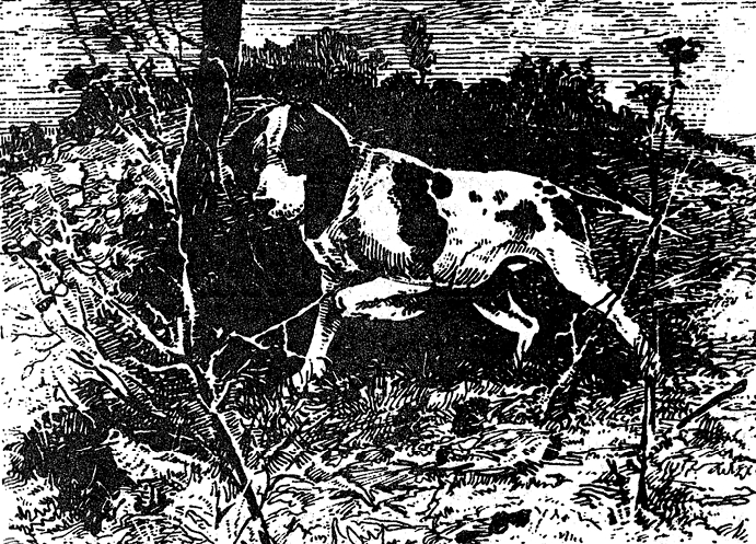 4) Как только будет видно, что собака почуяла дичь и потянула к ней, охотник с окриком «Тубо!» приближается к ней, берет кончик своры и, когда собака сделала стойку, в петлю своры продевает небольшой колышек и втыкает его в землю, так что собака уже не может двинуться в места, не ощущая боли от давящего ее ошейника или от уколов парфорса. Затем охотник, не переставая успокаивать собаку, осторожно подходит к ней, и если дичь не поднялась при его приближении, то, приласкав своего ученика, вытаптывает притаившуюся птицу. Это делается с тою целью, чтобы в уме собаки при первых ее встречах с живою дичью, которые навсегда останутся в ее памяти, не возникло представления о том, что она может поднять дичь без помощи своего хозяина.