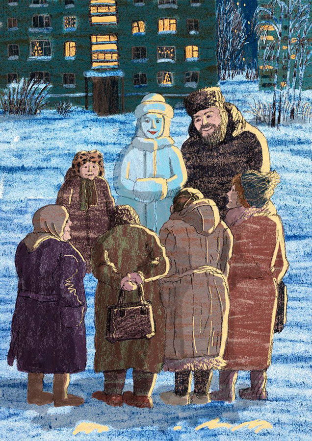 Славка с папой вернулись домой, попросили маму одеться. Она надела шубу прямо на свой халат и вышла посмотреть на Снегурочку. Вокруг неё уже собрались бабушки, которые сидели около других подъездов.