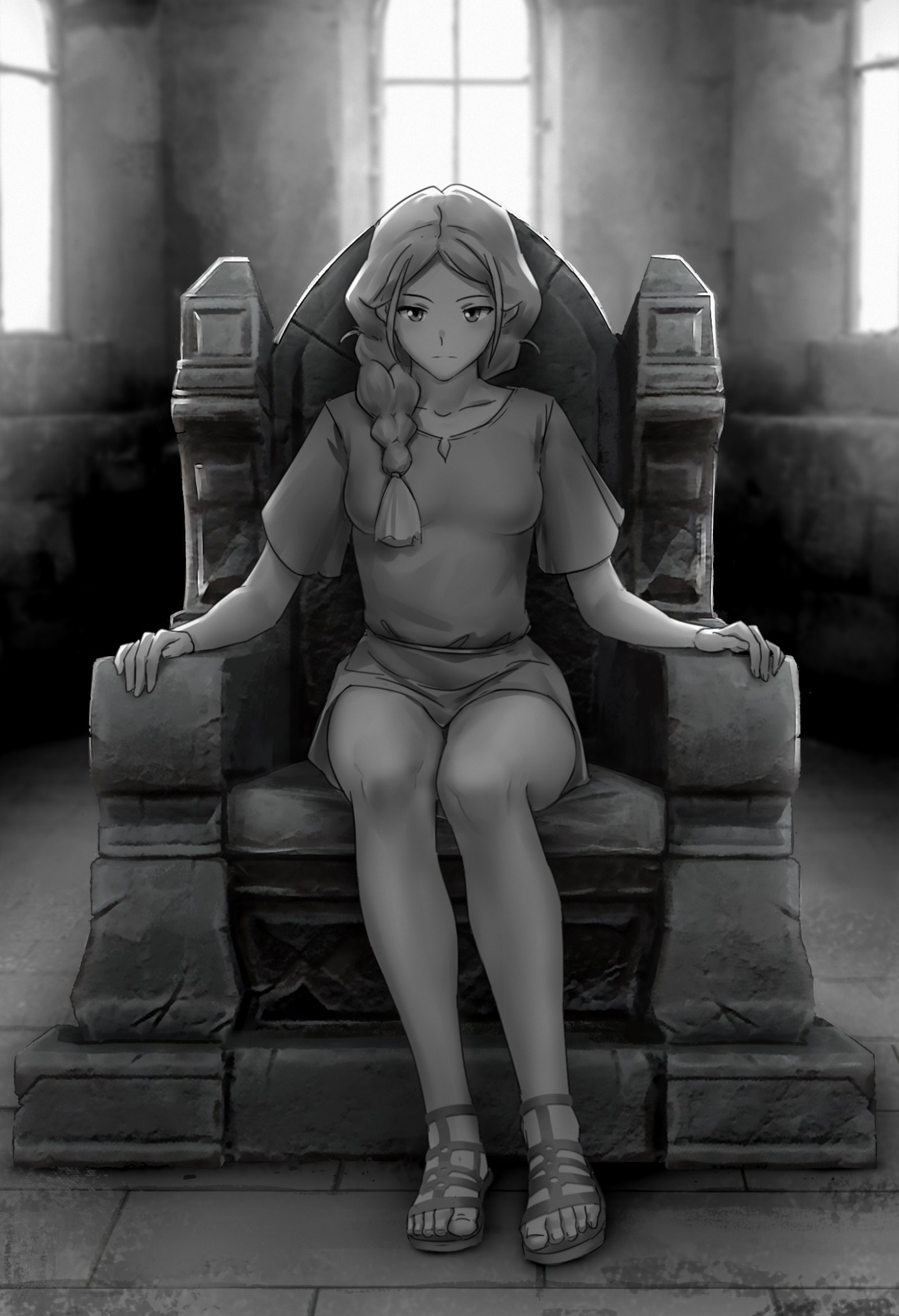 Спустя какое-то время, она вышла в большой зал. Зал играл множеством ярких и светлых цветов, но преобладающими, все же, были желтый и оранжевый. В зале было множество колонн, а также несколько статуй, которые, казалось, были сделаны из чистого золота, а в дальнем конце зала был каменный трон, что немного нарушал гармонию зала.