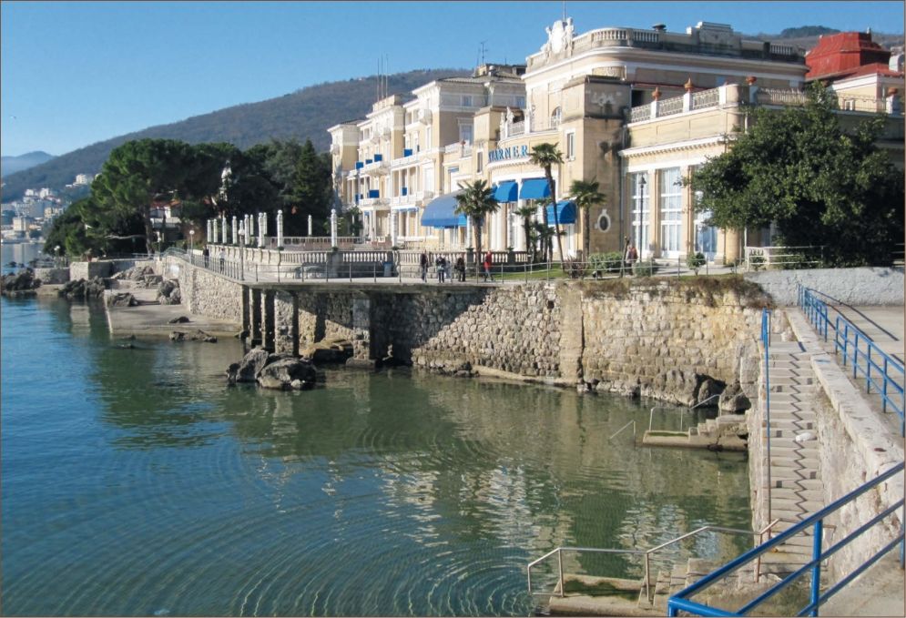 ür die Menschen Kakaniens, des Landes unter dem Doppeladler, ist es das Traum-Reiseziel schlechthin: Abbazia, die aus dem Nichts gewachsene Versammlung von kaisergelben Hotelpalästen und Villen im nordwestlichen Winkel des Golfs von Fiume. Klimatischer Curort und Seebad zugleich, verheißt es seinen Gästen den Eintritt in die elitäre Welt des Müßiggangs und des exklusiven Vergnügens. „Herrliche Paläste winken mir zu im Lorbeerhaine, Prunk und Pracht, schöne Frauen, liebliche Musik! Als ob das Feinste der feinen Welt sich hier versammelt hätte, um mich zu grüßen“, schwärmt Besucher Peter Rosegger in seiner Reiseskizze Am Strande von Abbazia. Ja, ihm, dem Dichter aus dem Norden, der ansonsten den Besuch von Kurorten vermeidet, ist hier am Ufer des Quarnero so „wohl wie einem Seligen nach Erdennoth und Sterben“, er feiert hier die mystische Begegnung mit dem „sommerlich sonnigen Meer“, der „gewaltigen Harfe Gottes“: „Ich liebe das Meer und bade in demselben mein Herz.“