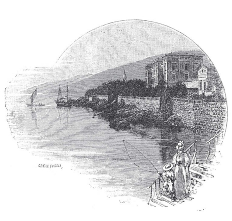 Die besondere Aufmerksamkeit Scarpas gilt der Gestaltung des Parks, für den er zahlreiche exotische Pflanzen nach Istrien bringen lässt, darunter Magnolien, Libanonzedern, Himalayazypressen und die japanische Kamelie (Camelia japonica). Um mit seiner Jacht bequem unmittelbar vor dem Ort vor Anker gehen zu können, investiert Higinio Scarpa auch noch in den Ausbau des Hafens, genannt „Porto Herdt“ – eine Verballhornung des Wortes rt (= „Landzunge“). Der leutselige Unternehmer führt ein offenes Haus und lädt immer wieder Gäste ein, für die er sogar einen eigenen Pendelverkehr mit Zweispännern zwischen Abbazia und Fiume einrichtet. Seine glanzvollen Feste erfreuen sich in der Fiumaner Gesellschaft großer Beliebtheit und bald kann er sich spektakulärer Besuche rühmen: 1854 kommen der Banus von Kroatien, Josef Freiherr von Jellačić, und seine Frau; 1860 hält sich Kaiserin Maria Anna zur Kur in Abbazia auf – die Villa Angiolina wird zum beliebten Anlaufpunkt der Ersten Gesellschaft des Reichs und mit ihr rückt auch die Region am Quarnero allmählich immer deutlicher ins Blickfeld des österreichischen und ungarischen Adels. Noch ist Abbazia ein Geheimtipp, doch langsam beginnt das einst so verschlafene Fischerdorf sein Gesicht zu verändern: Gegen Ende der 1860er-Jahre werden erste private Hotels und Gästehäuser errichtet und die Zahl der Besucher steigt. Unter jenen nicht allzu vielen „Touristen“, die in dieser Zeit bereits den Weg in den österreichischen Süden finden, ist auch der bayrische Reiseschriftsteller Heinrich Noe (1835 – 1896). Auf seinen Wanderungen durch die Karstlandschaften Istriens und Dalmatiens kommt der polyglotte Münchner – angeblich kann er sich in 18 Sprachen verständigen – auch in das kleine Fischerdorf Abbazia und genießt hier die Gastfreundschaft der Familie Scarpa.